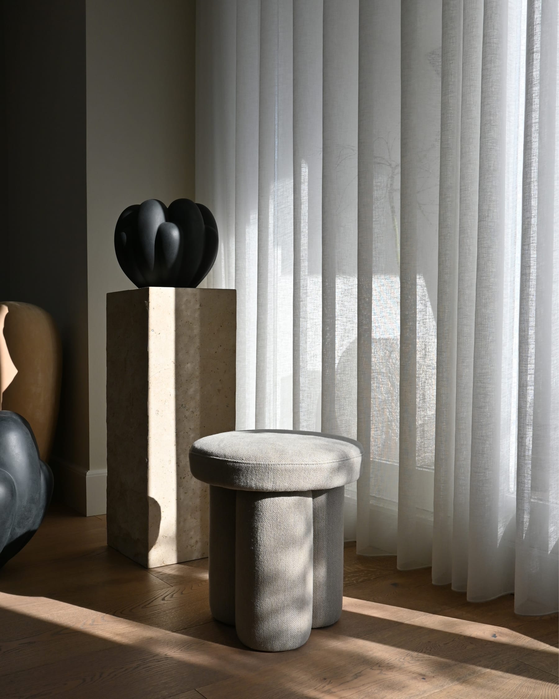 The Big Foot Stool comes in a natural sand color linen, offering a refined yet textured appearance that beautifully complements the stools minimalist aesthetic. Produced in Nothern France, the linen fibers are of highest quality, adding to the luxurious feeling of the chunky fabric. The coarse weave gives the textile a rough look with a rich texture.