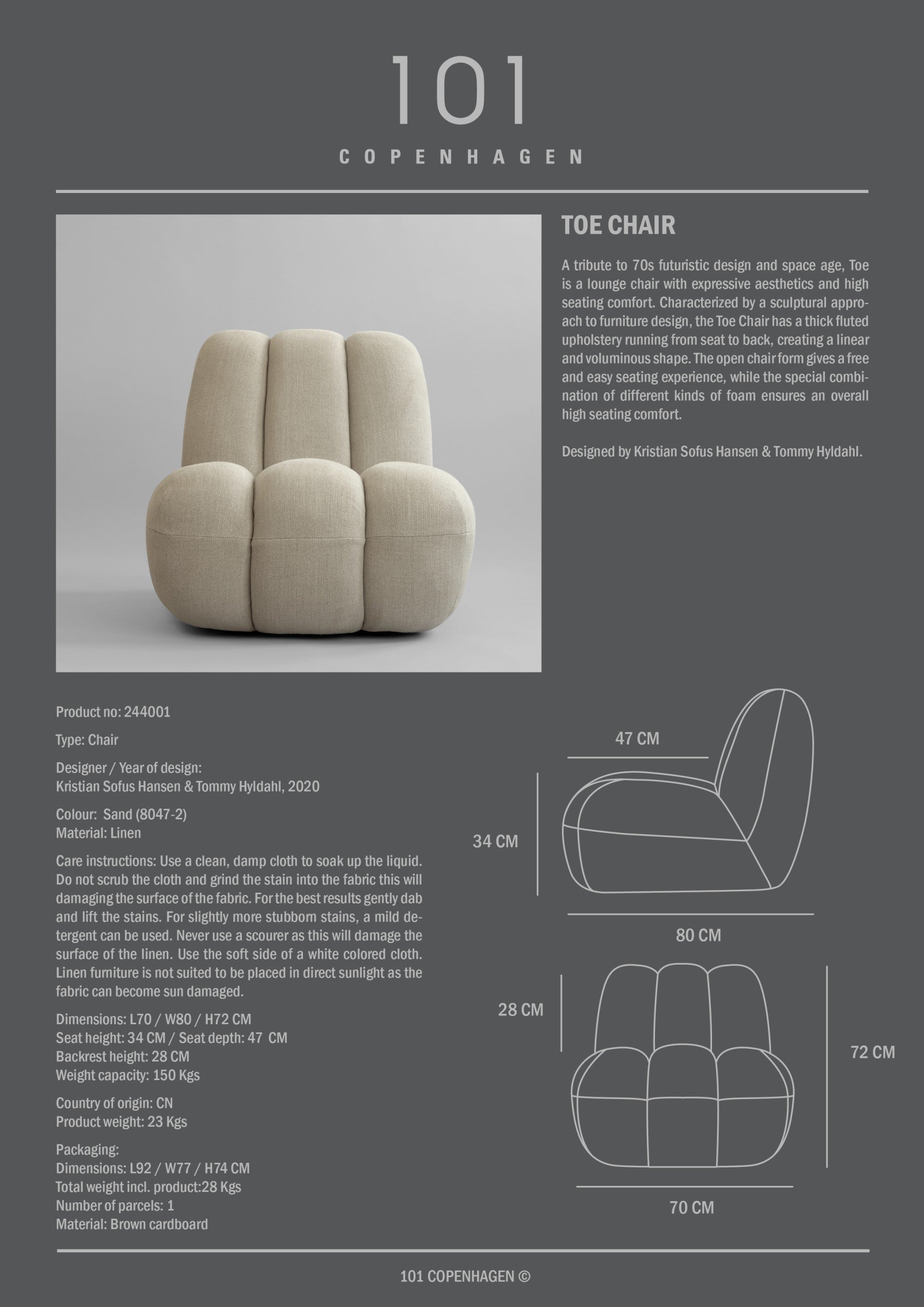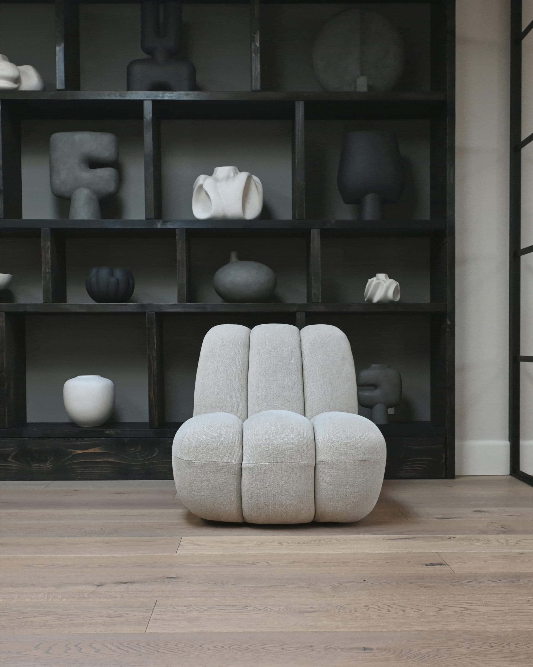 Upholstered in a natural sand colour linen, offering a refined yet textured appearance that beautifully complements the chairs minimalist aesthetic. Produced in Nothern France, the linen fibers are of highest quality, adding to the luxurious feeling of the chunky fabric. The coarse weave gives the textile a rough look with a rich texture.