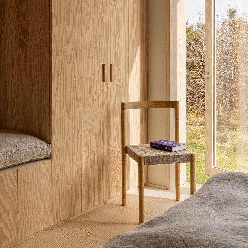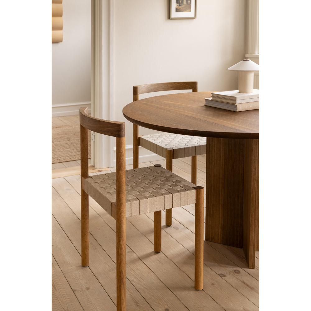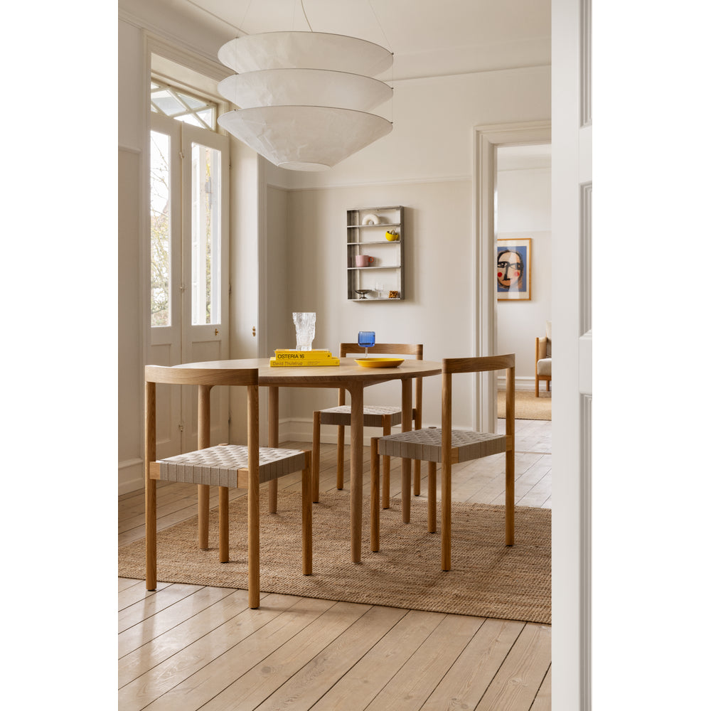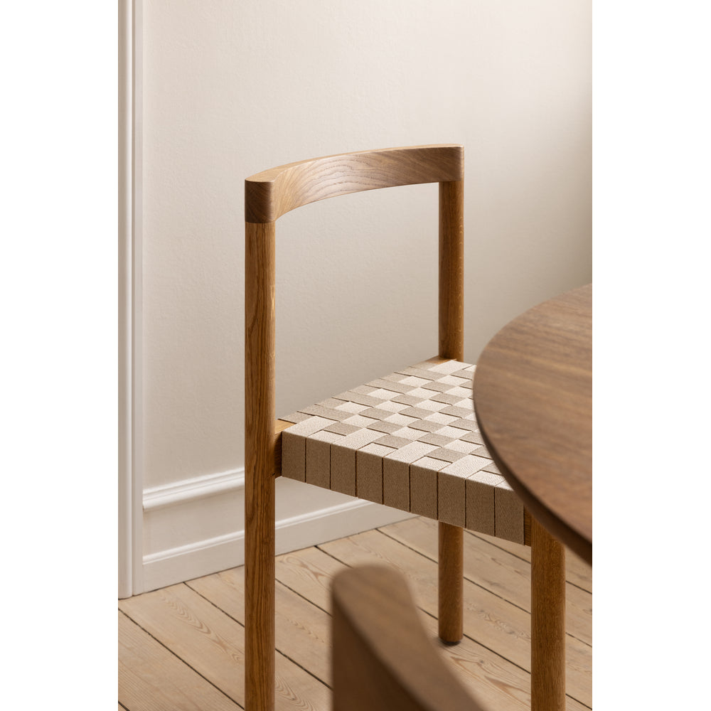 Details: Designer: Henning Larsen Dimensions: H: 31.1" x W: 18.8", Seat Height 16" x Seat Depth 16" Material: Oiled Oak or Fumed Oak, Flax Webbing, Veneered or Upholstered leather seat