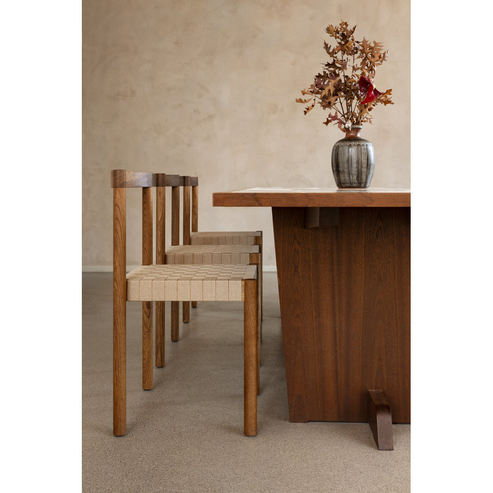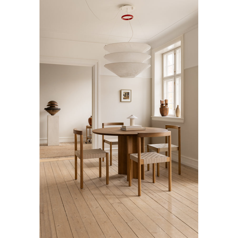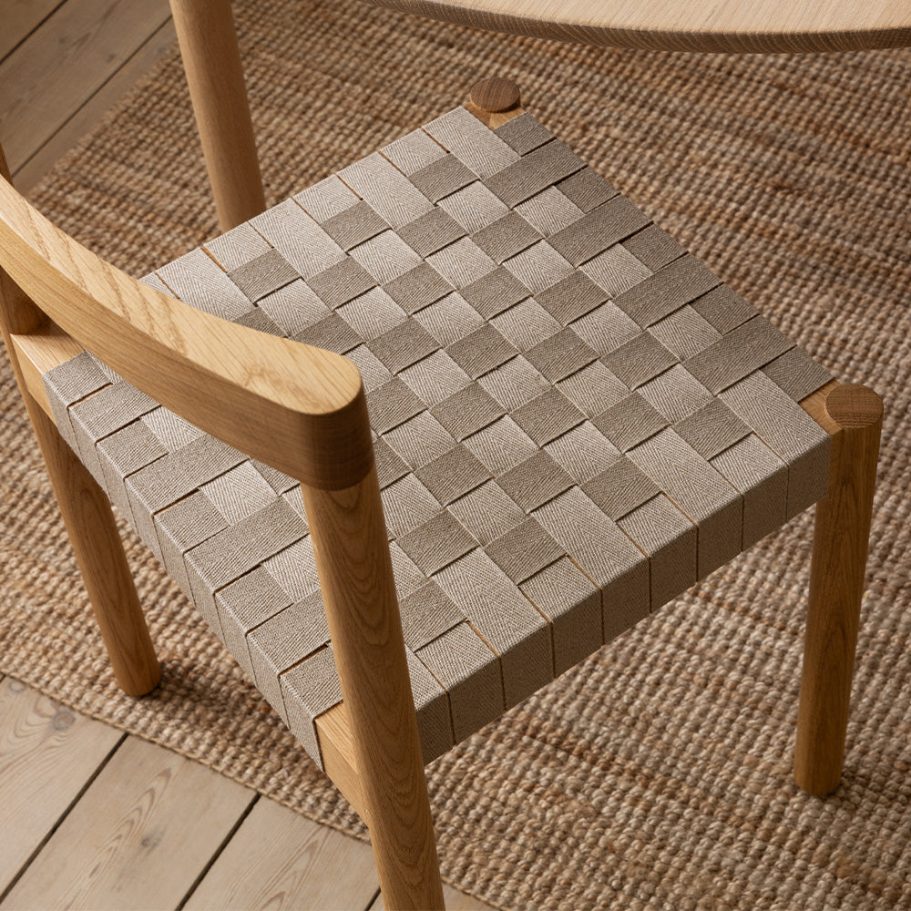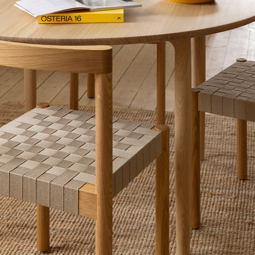 Details: Designer: Henning Larsen Dimensions: H: 31.1" x W: 18.8", Seat Height 16" x Seat Depth 16" Material: Oiled Oak or Fumed Oak, Flax Webbing, Veneered or Upholstered leather seat