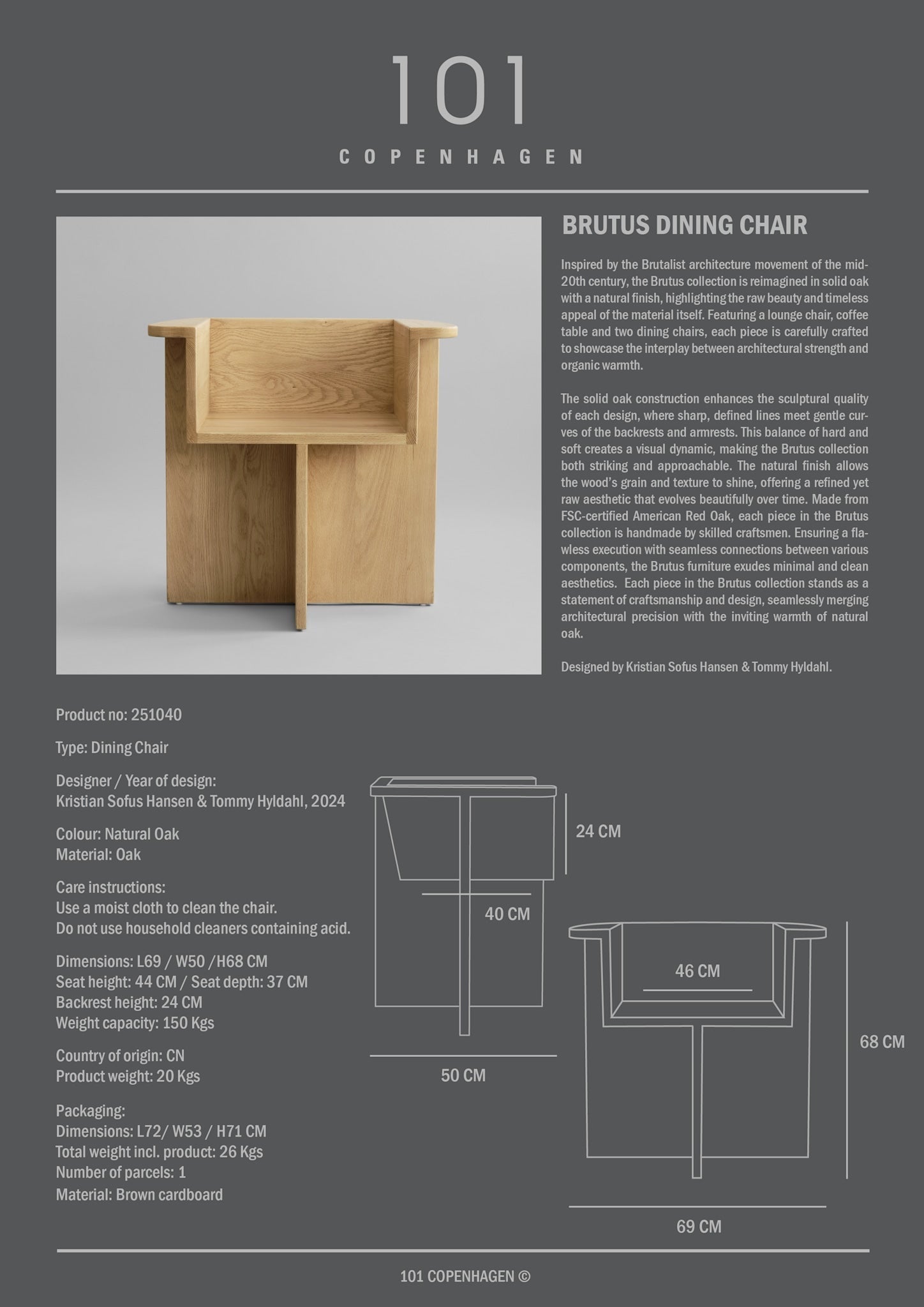 Inspired by the Brutalist architecture movement of the mid-20th century, the Brutus collection is reimagined in solid oak with a natural finish, highlighting the raw beauty and timeless appeal of the material itself. Featuring a lounge chair, coffee table and two dining chairs, each piece is carefully crafted to showcase the interplay between architectural strength and organic warmth. The solid oak construction enhances the sculptural quality of each design, where sharp, defined lines meet gentle curves of the backrests and armrests. This balance of hard and soft creates a visual dynamic, making the Brutus collection both striking and approachable. The natural finish allows the wood’s grain and texture to shine, offering a refined yet raw aesthetic that evolves beautifully over time. Made from FSC-certified American Red Oak, each piece in the Brutus collection is handmade by skilled craftsmen. Ensuring a flawless execution with seamless connections between various components, the Brutus furniture exudes minimal and clean aesthetics. Each piece in the Brutus collection stands as a statement of craftsmanship and design, seamlessly merging architectural precision with the inviting warmth of natural oak.