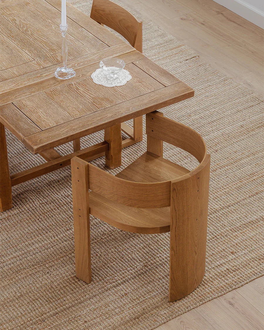 The Collector Dining Chair’s reflective design evokes a sense of honesty and simplicity with its selected silhouette. The unique curves exemplifies in this piece Kristina Dam’s pledge of minimalism and geometrics - and this curved form reflects the curved details on the outdoor steel furniture from ous Bauhaus series. From the arch of the dining chair arises three legs that embraces the seat and backrest in a single movement. This might just seem like a simple aesthetic, but it brings however a multitude of complex design details that push the conventional limits of craftsmanship. The dining chair is is crafted in oak veneer and olied. The dowels fittings are made in walnut tbringing a warmth finish to the chair. Besides this, walnut is a re-appearing element in the Kristina Dam universe and firstly associated with the Stack storage boxes from our design collection. The Collector Dining Chair is created with an inherent minimalistic feel and a timeless aesthetic, the subtle design and comfortable dimensions make it suitable for both domestic and professional use, where uncompromising quality is imperative. The chair is also available with upholstery in cognac leather.