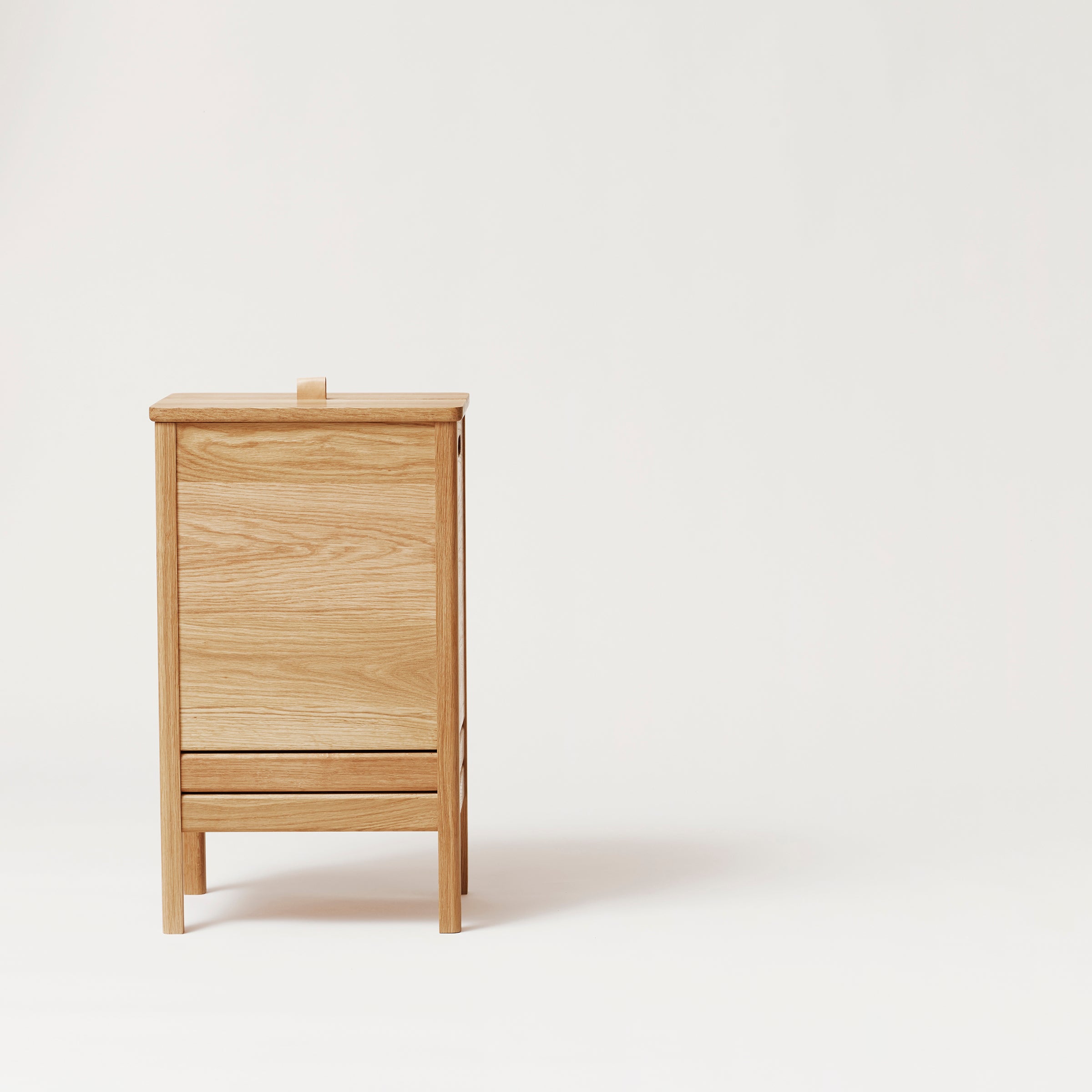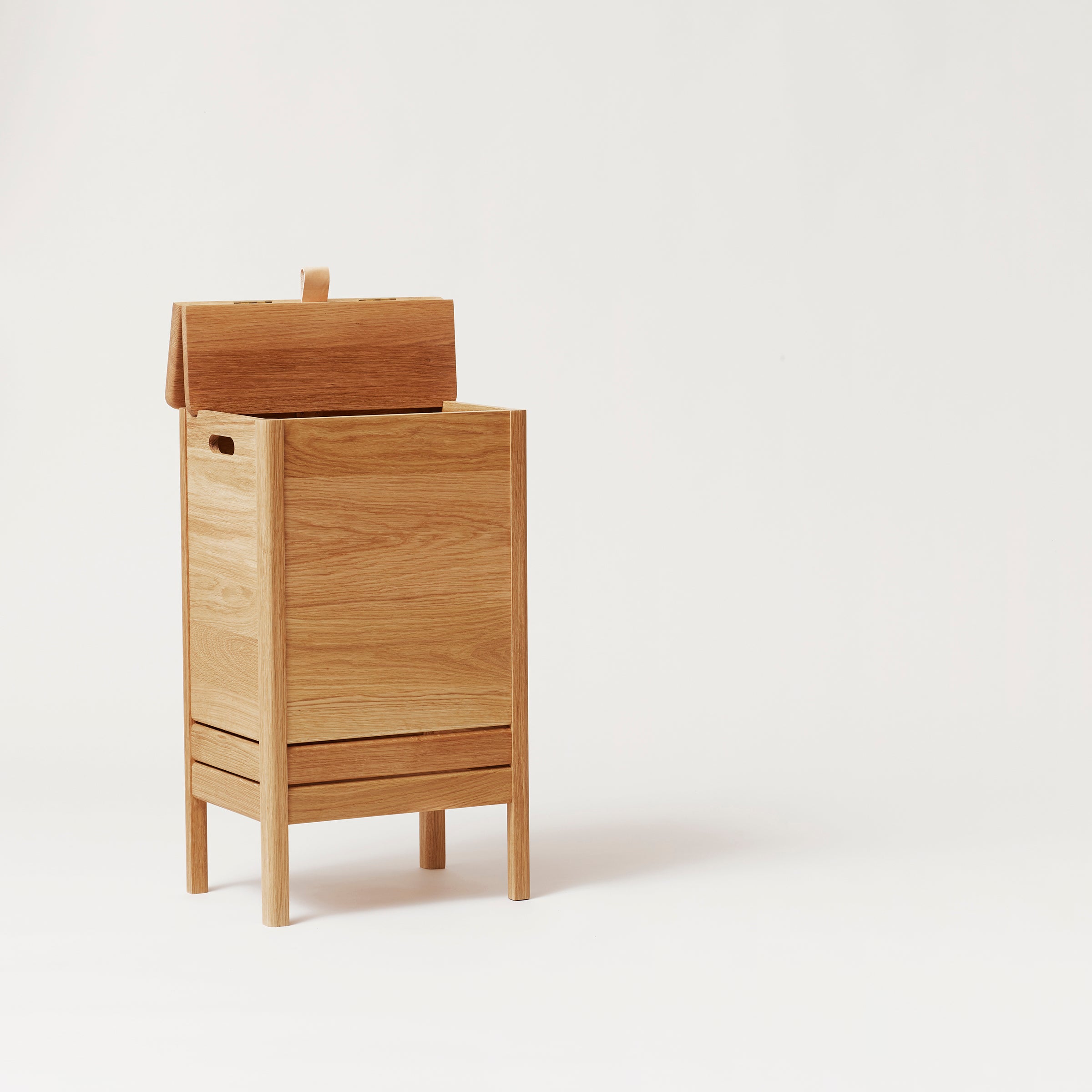 This laundry box is a rediscovered classic made of solid oak with highly durable quality. It is a very practical box with a large storage space. The lid is lifted by a small leather handle and the construction holds the lid in place while used. The handles on each side make it possible to move the box around easily while in use. The two straight lines let the air inside the box ventilate naturally, an important feature for a laundry box. The lower cut of the two legs and angles give it a feeling of being lifted up while the overall design is solid and robust. The A Line Laundry Box is a special piece of furniture that can take a prominent position in your home.