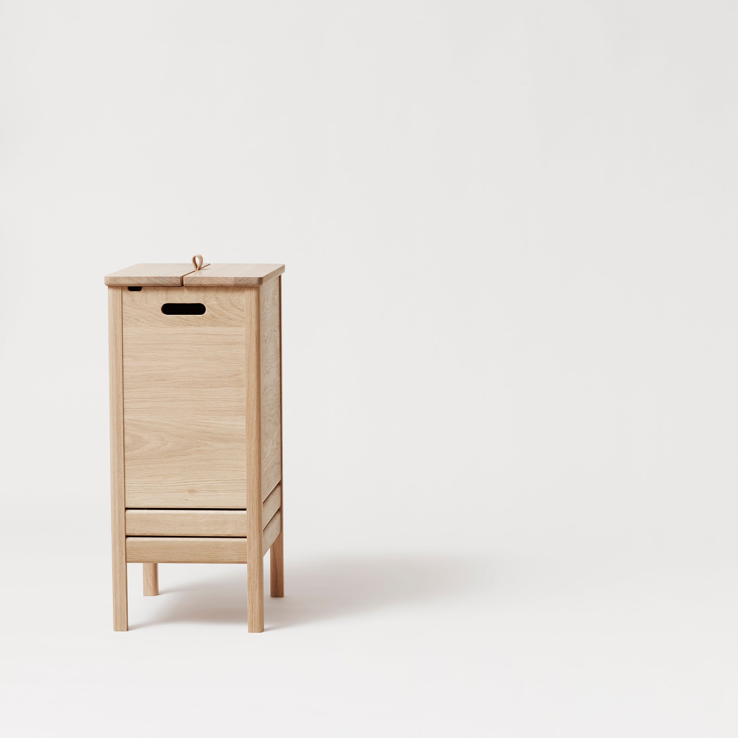 This laundry box is a rediscovered classic made of solid oak with highly durable quality. It is a very practical box with a large storage space. The lid is lifted by a small leather handle and the construction holds the lid in place while used. The handles on each side make it possible to move the box around easily while in use. The two straight lines let the air inside the box ventilate naturally, an important feature for a laundry box. The lower cut of the two legs and angles give it a feeling of being lifted up while the overall design is solid and robust. The A Line Laundry Box is a special piece of furniture that can take a prominent position in your home.