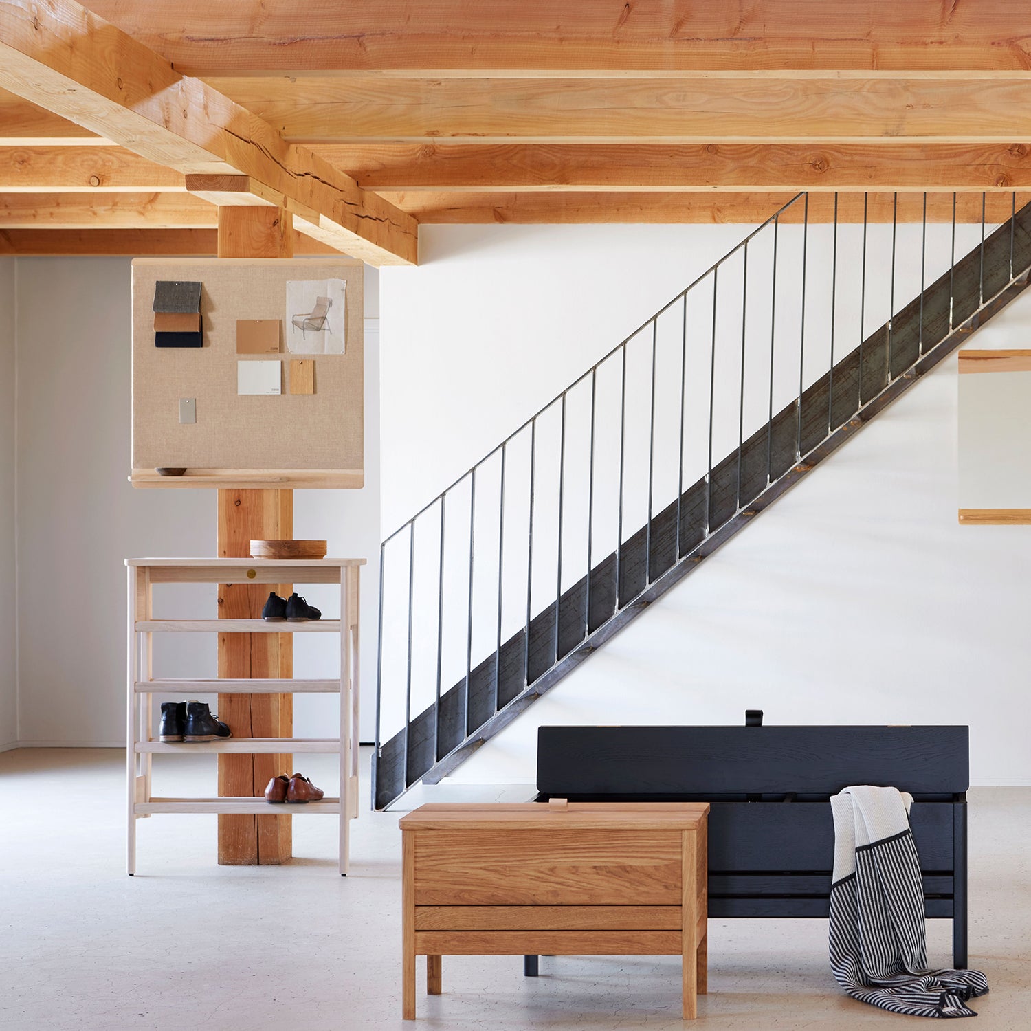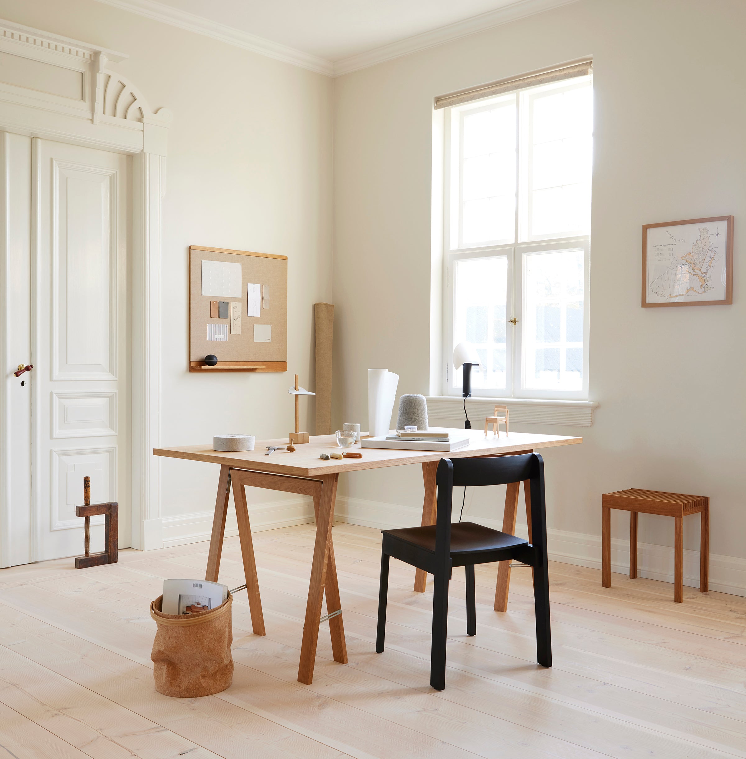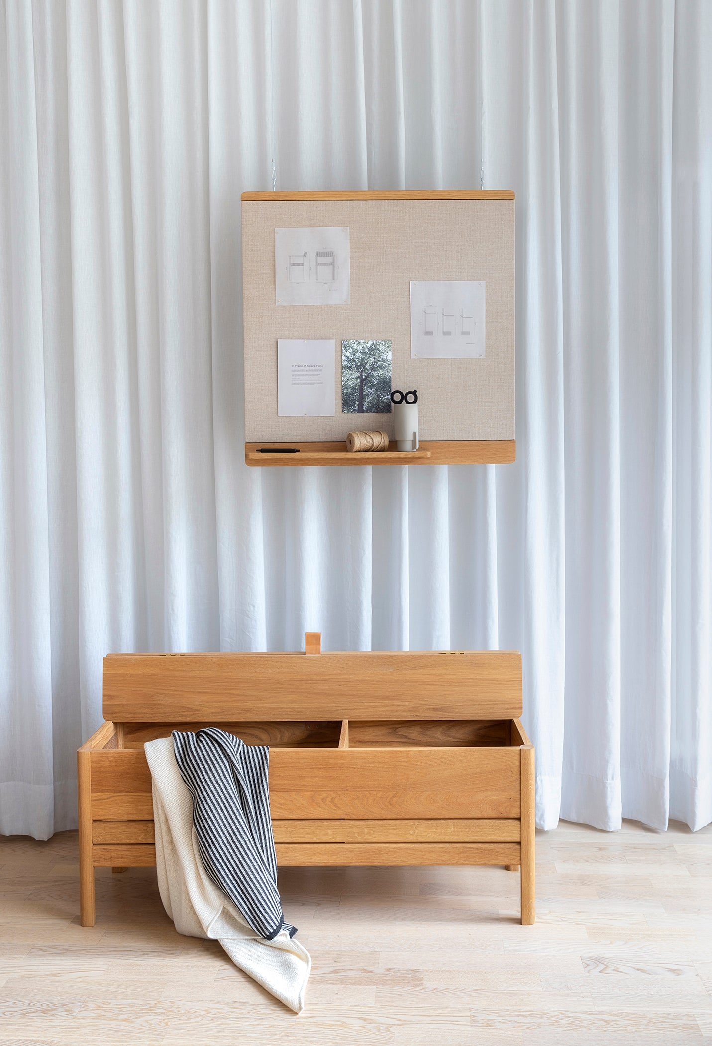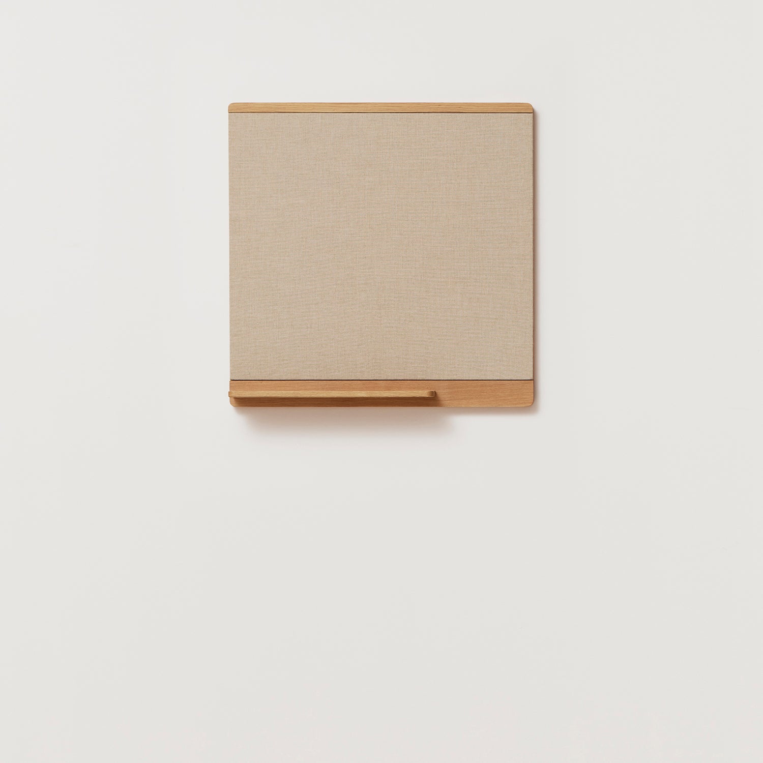 "We wanted to make a pinboard with a small shelf, something which is not often included on such objects but would be useful for storing small items like needles and pens. We were looking for a warm and soft look where the fabric should match the warmness of the oak. The frame of the pinboard has a large radius on the back which lifts it from the wall with a soft shadow." – Herman Studio
