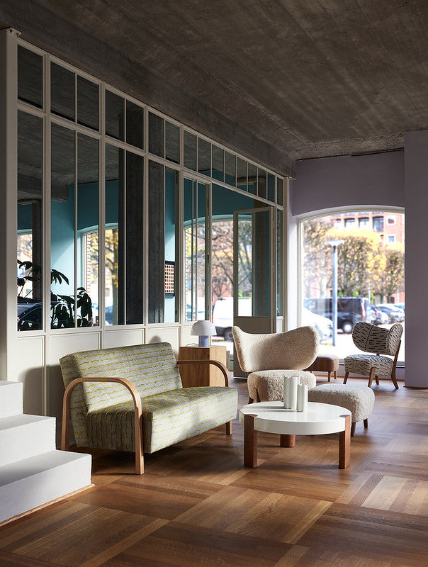 Gravitational solid oak legs gracefully meet creamy white piano lacquer in a soft, broken circle. With an invitation to let everything from books to your legs, light and heavy, rest on the solid craftsmanship.