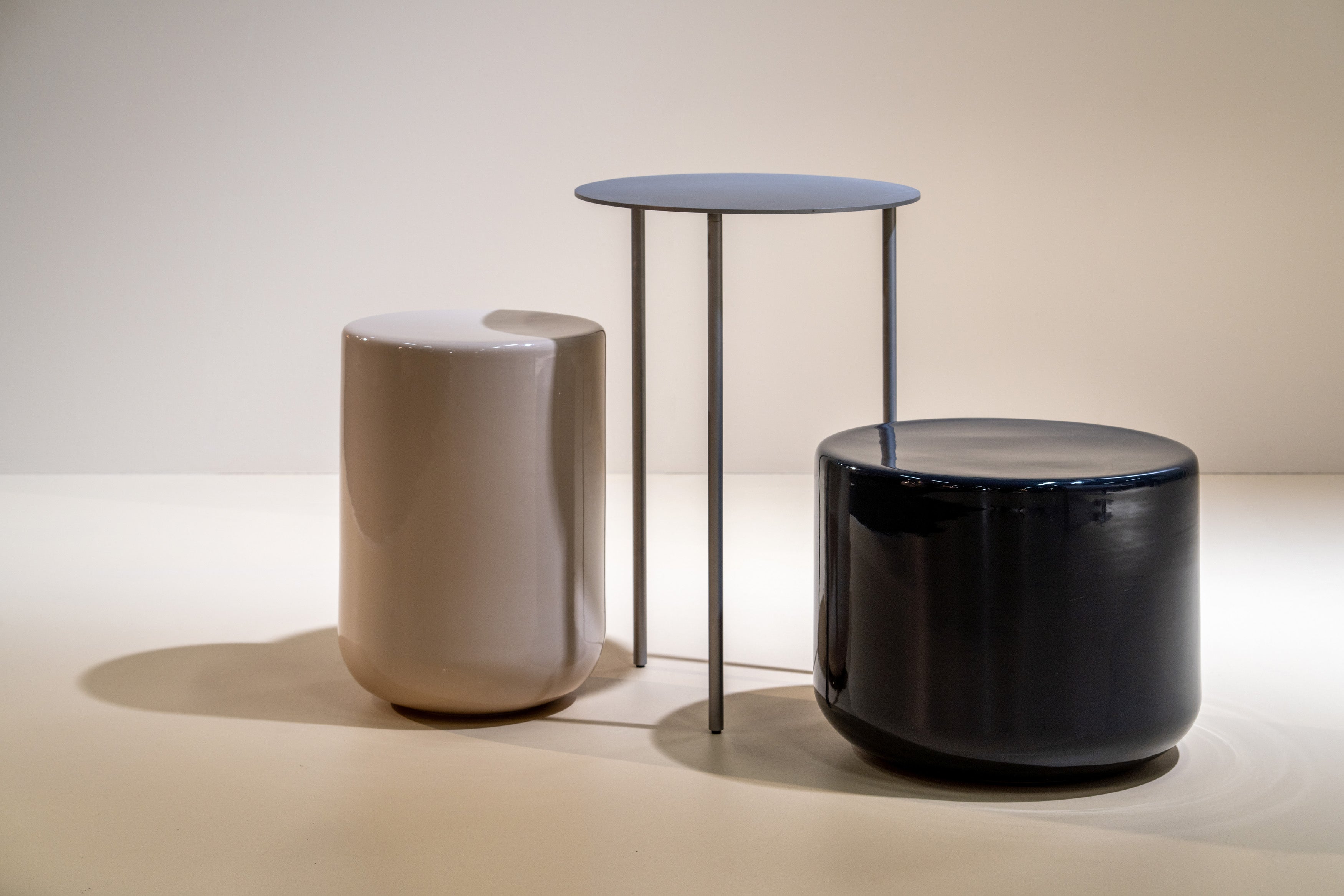 The ceramic piece is uniquely handcrafted from clay. After being burnt, the clay gets a high gloss glaze finish. During the process, streaks, pinholes and other variations occur and create an irregular surface that guarantees a limitless combination of textures and surfaces with an appealing graphical effect. The ceramic table is an upscale large version of a ceramic pot which was the source of inspiration. Designed by David Thulstrup for Møbel Copenhagen.