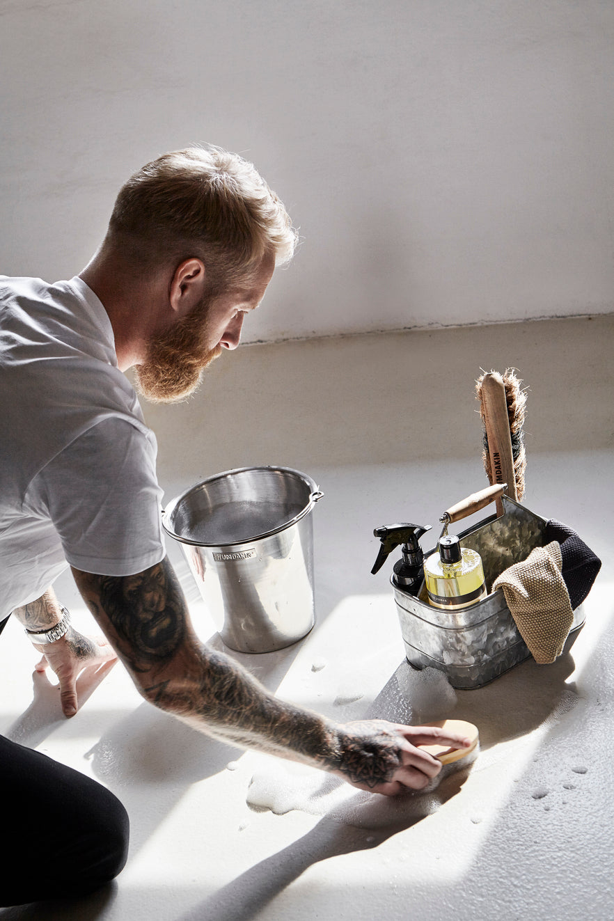 Zinc organizing bucket with wooden handle. This stylish zinc bucket has three compartments on one side and a single, large compartment on the other. This bucket is perfect to keep on your kitchen counter with oils and herbs, in your laundry room with different detergents, outside for your gardening tools or inside for your favorite HUMDAKIN cleaning products.