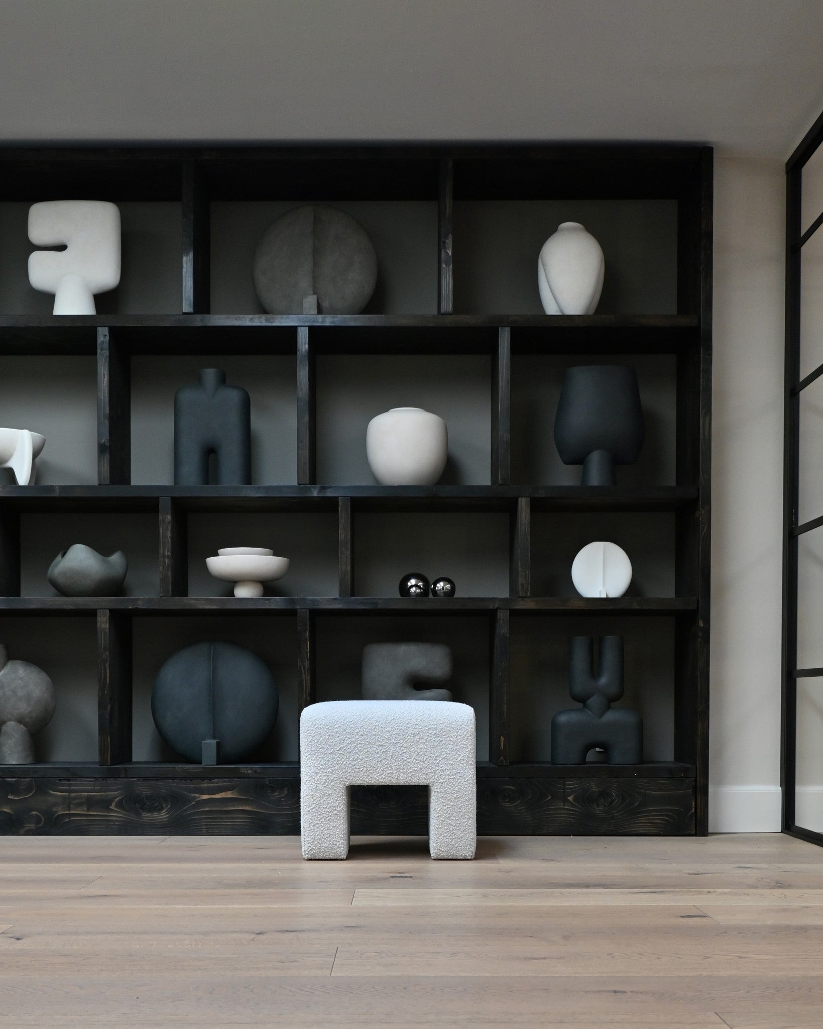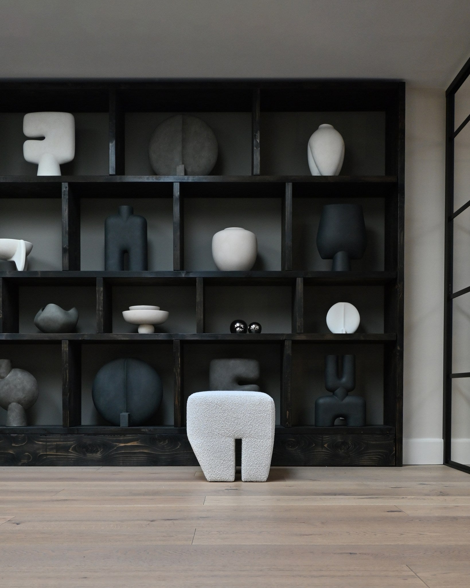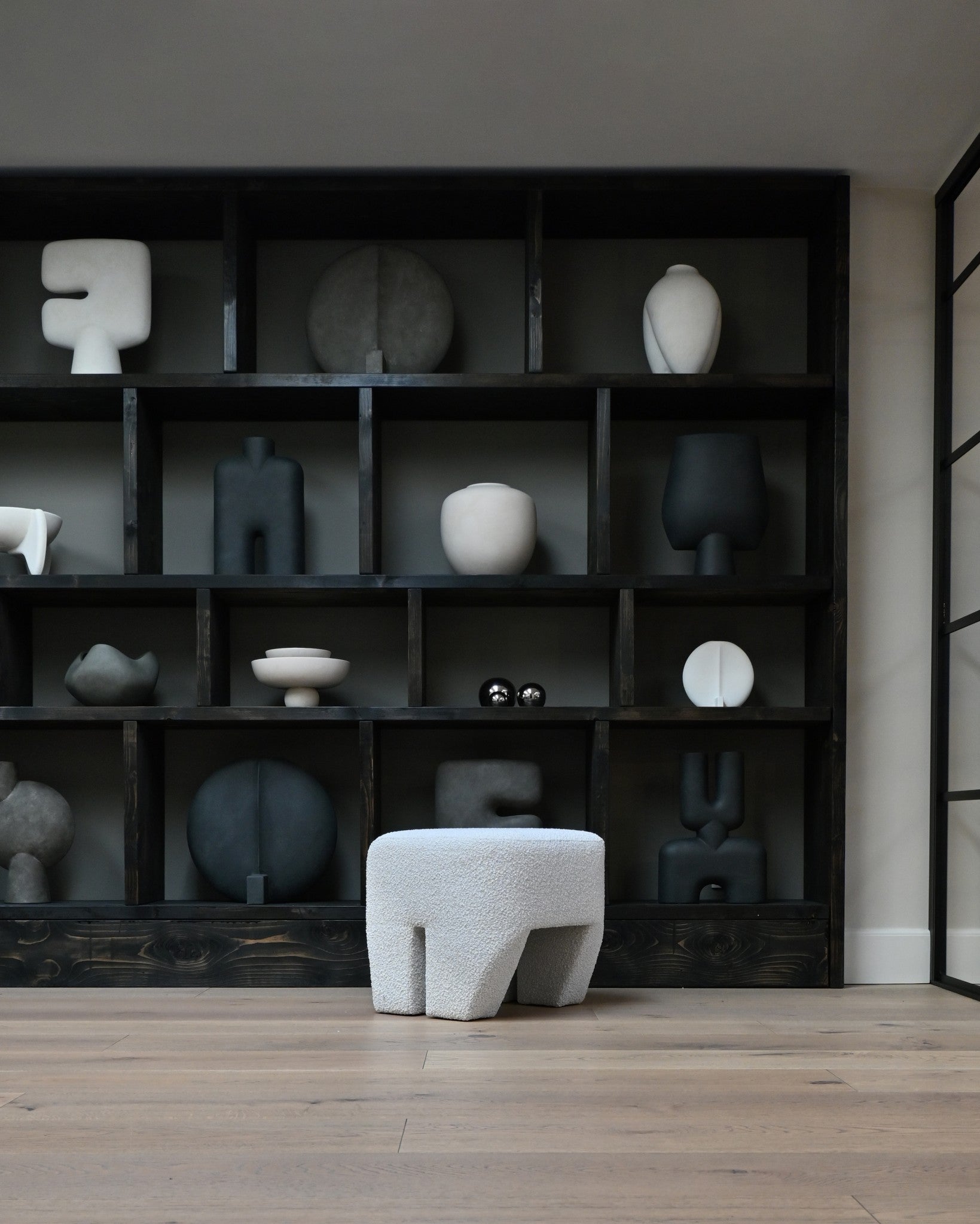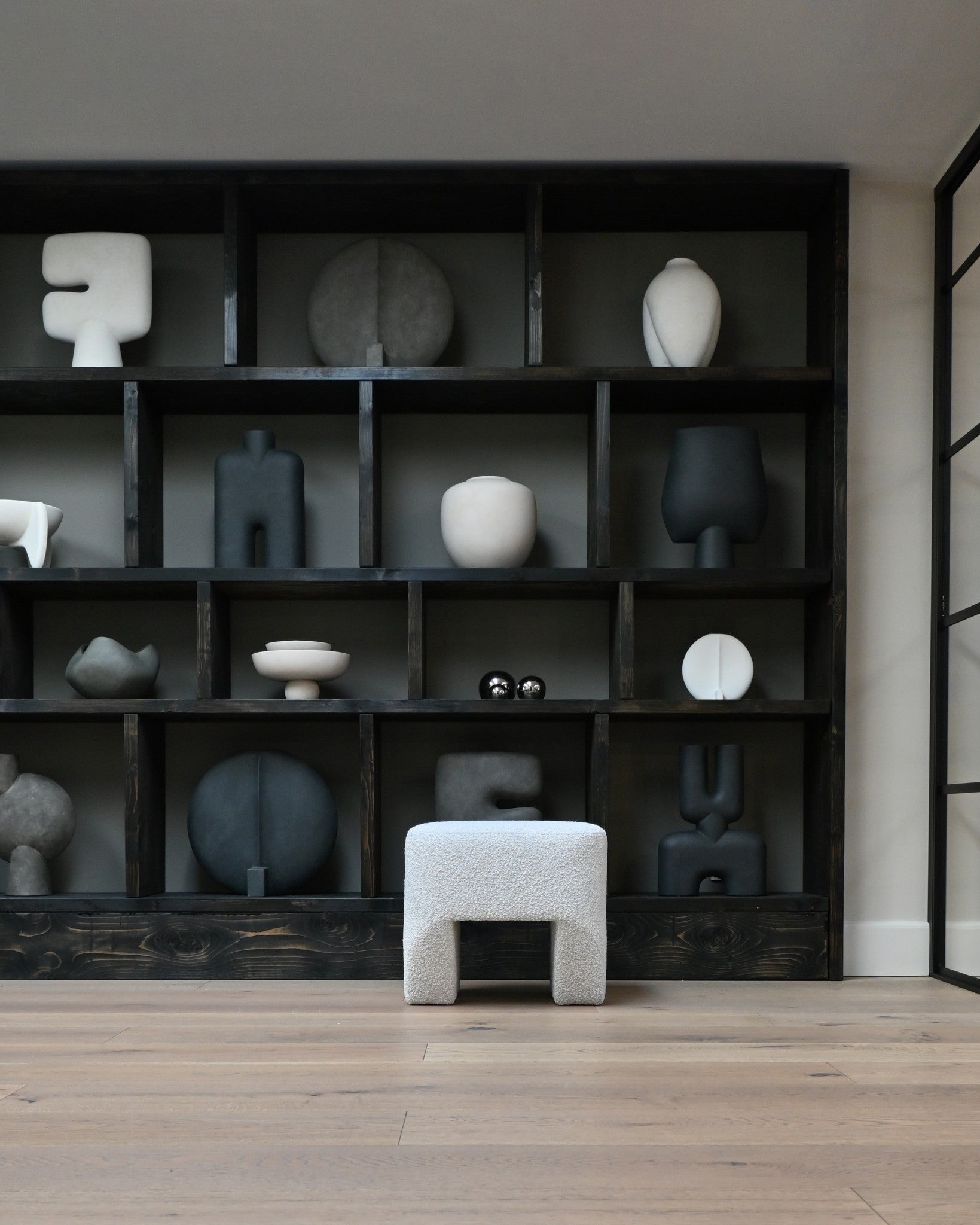 Sculpt Stool is also available in a in luxurious off white Bouclé. The Bouclé fabric adds a cozy, inviting touch with its soft and tactile surface, perfectly complementing the robust design with a hint of modern elegance.