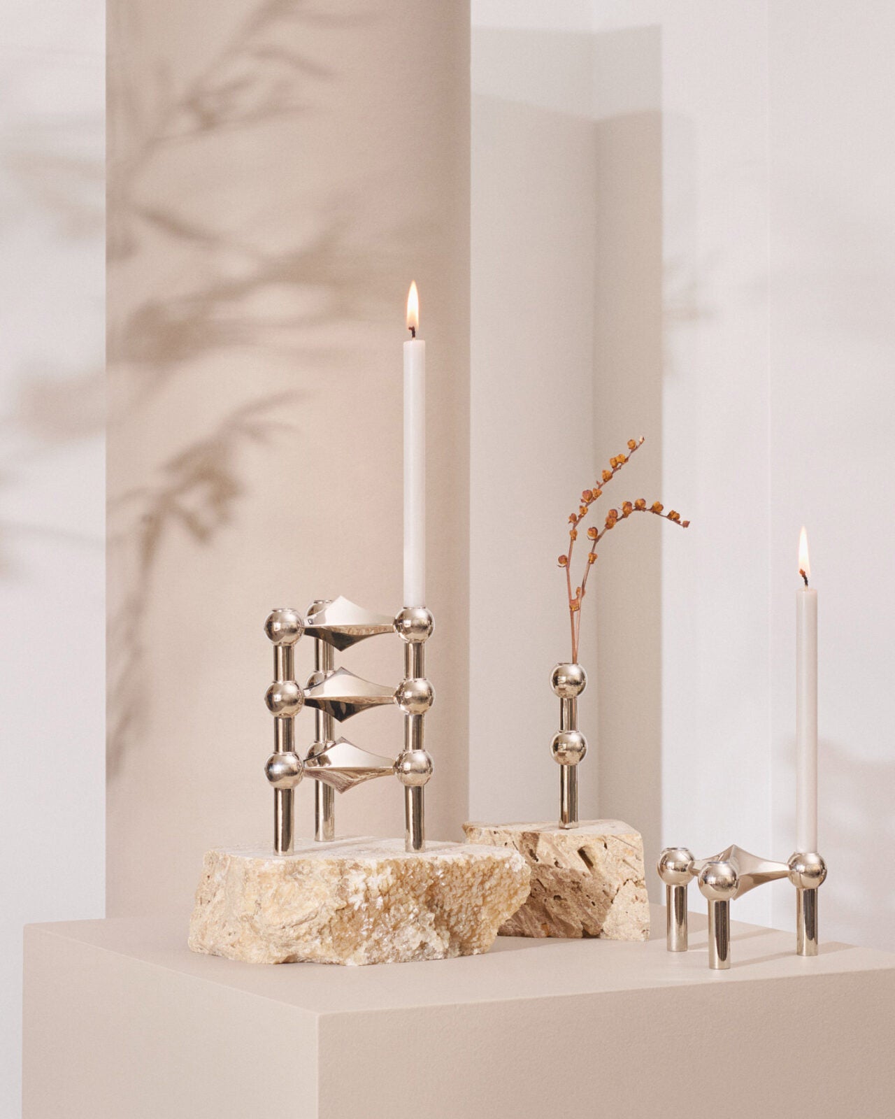 These candles match the STOFF Nagel candle holders beautifully. The candles are produced from paraffin wax, a pure mineral product cleansed of impure particles. Furthermore paraffin wax has the smallest carbon footprint and the least environmental impact of all waxes. The cotton wicks are made of 100% cotton, which affects the indoor climate less than traditional wicks, as fewer particles are released.