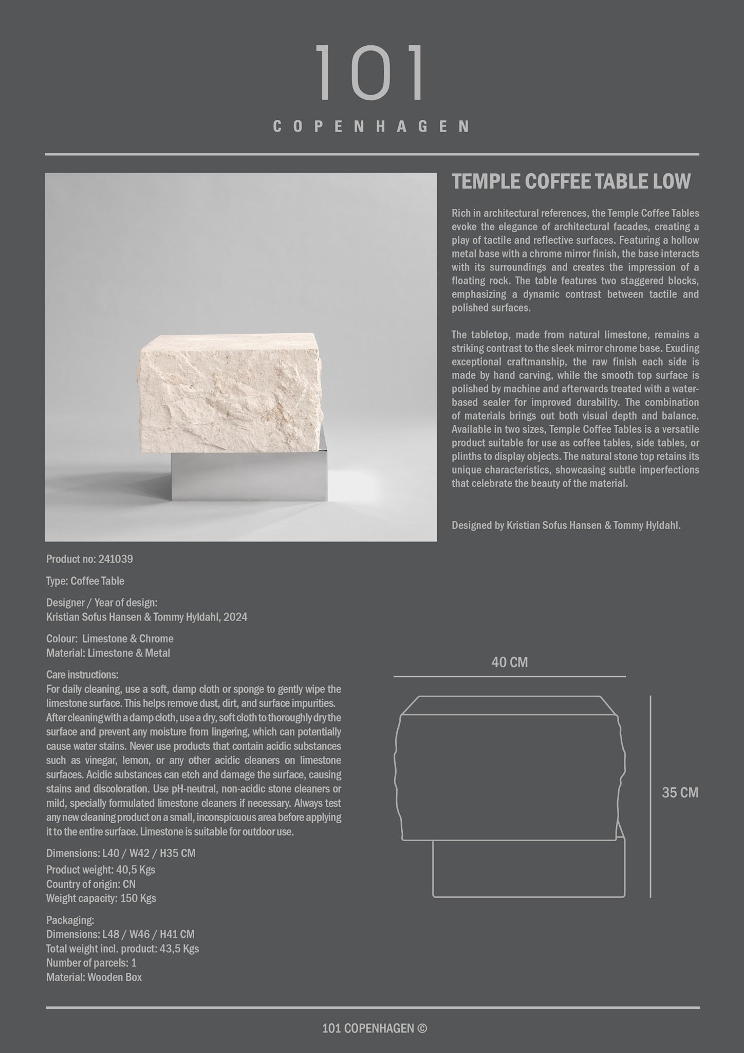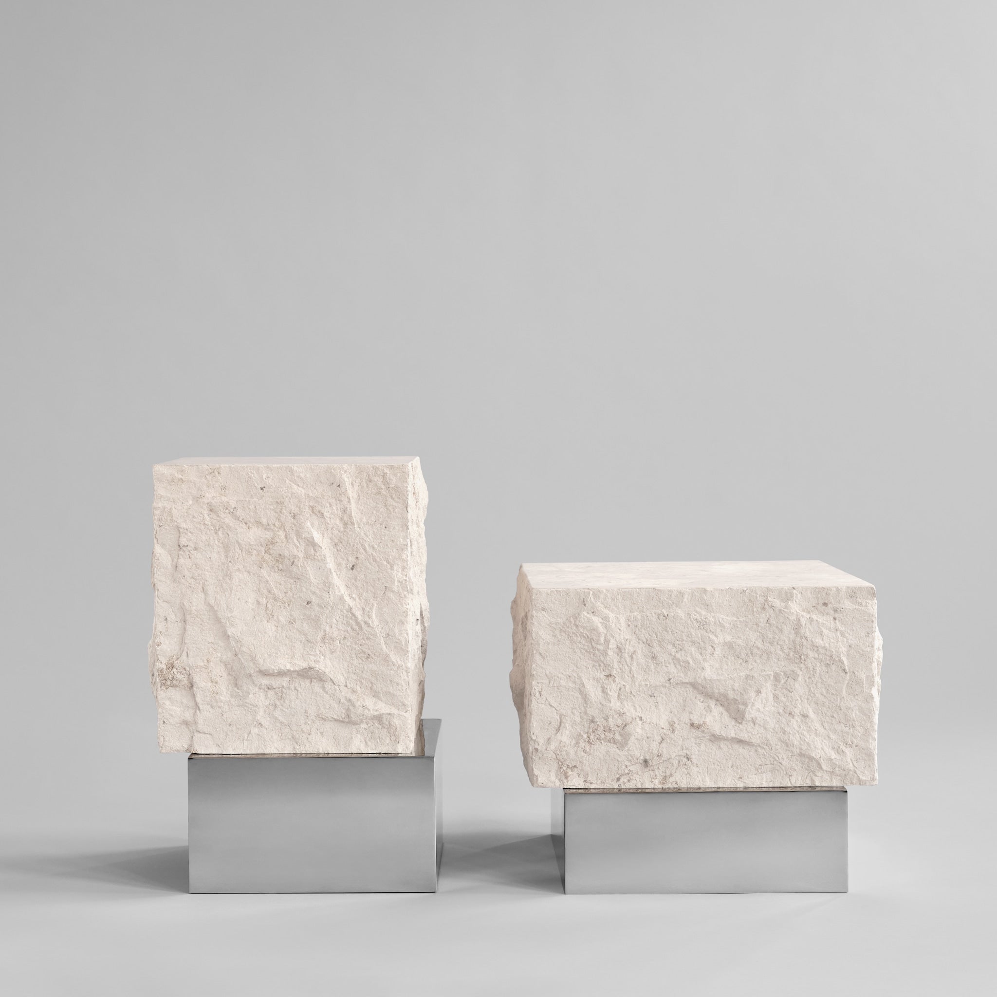 Rich in architectural references, the Temple Coffee Tables evoke the elegance of architectural facades, creating a play of tactile and reflective surfaces. Featuring a hollow metal base with a chrome mirror finish, the base interacts with its surroundings and creates the impression of a floating rock. The table features two staggered blocks, emphasizing a dynamic contrast between tactile and polished surfaces. The tabletop, made from natural limestone, remains a striking contrast to the sleek mirror chrome base.
