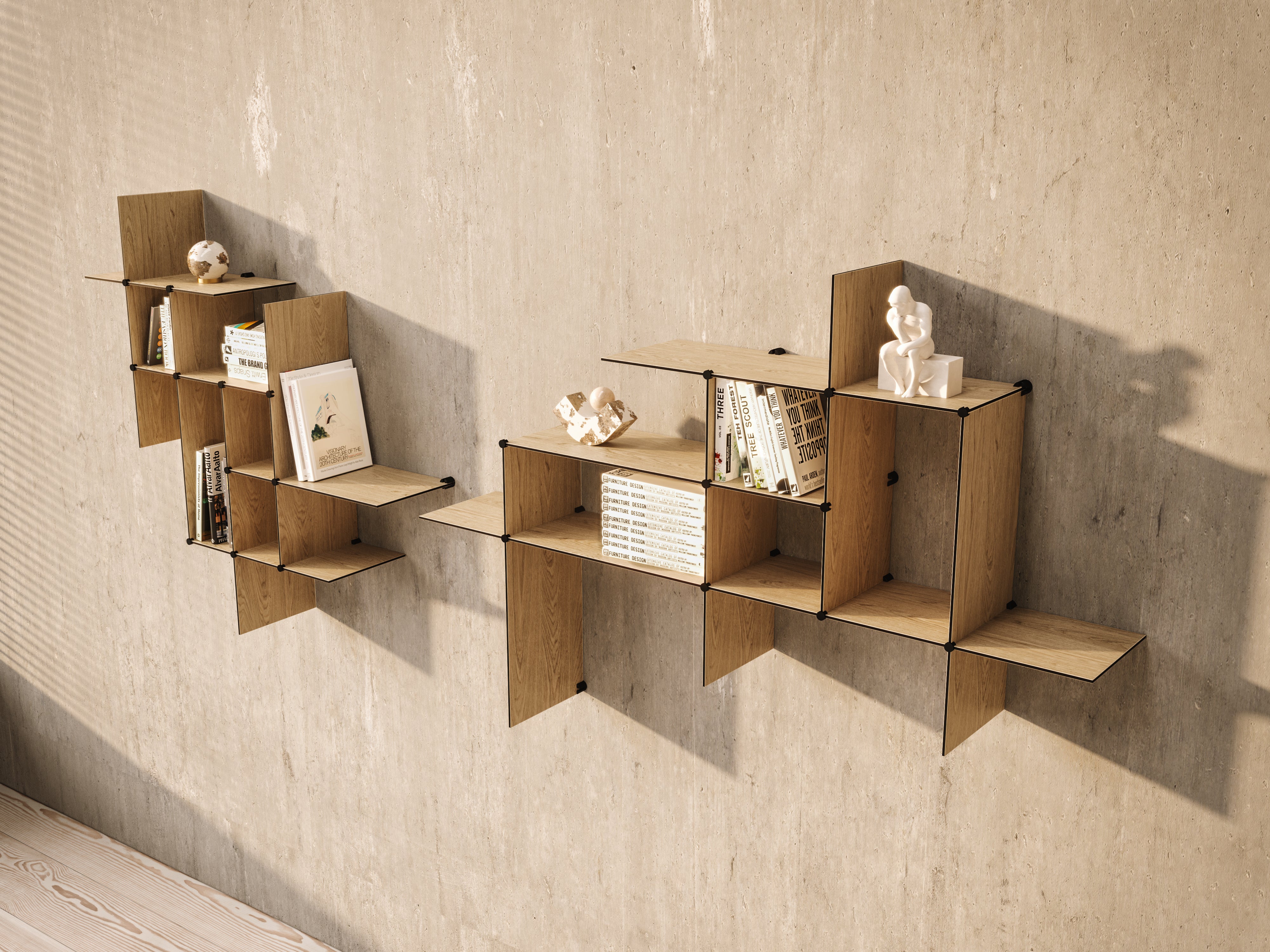 Up The Wall is a flexible shelf system that invites the customer to co-create. The shelves are sold in packages with one short and one long shelf that together form an asymmetrical cross. Assemble more sets of shelves as you wish and create your own unique storage solution customized for your needs. The load capacity is 11lbs. Made in Denmark.